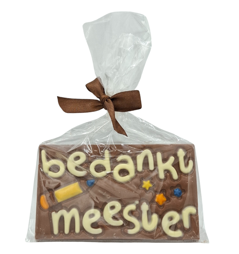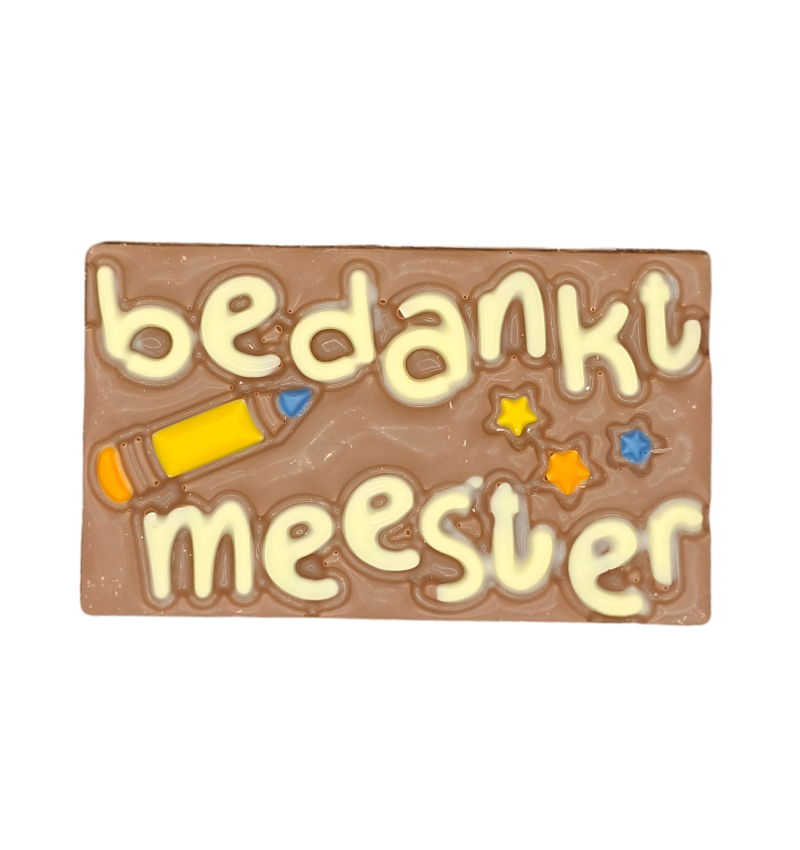Voor het einde van het schooljaar hebben we een heerlijke chocoladetablet gecreëerd met de tekst “Bedankt meester!”. Gemaakt van romige melkchocolade en perfect om waardering te laten zien.