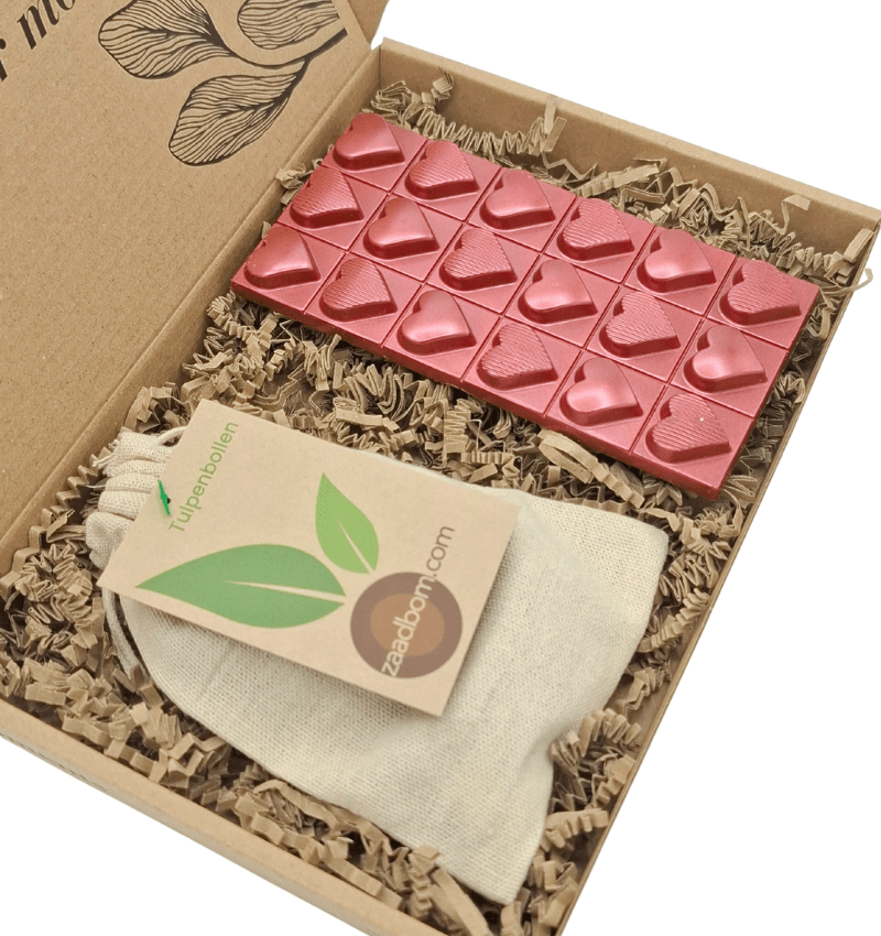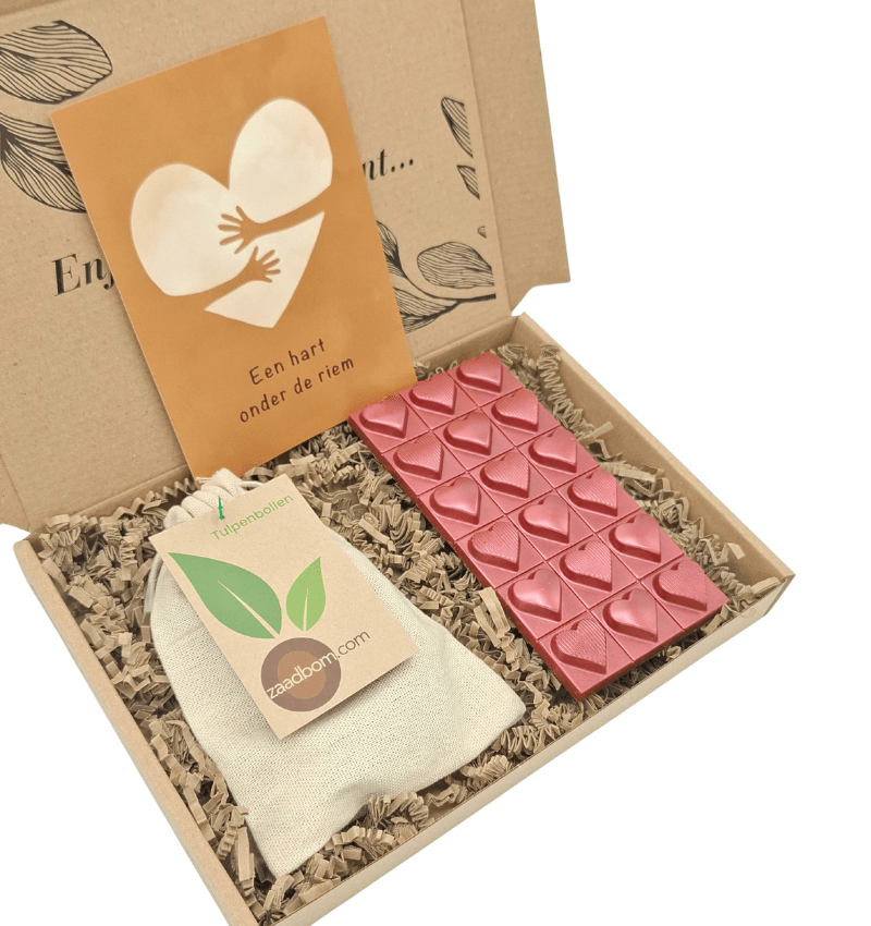 Een vrolijk en attent cadeau om iemand te verrassen. Dit pakket combineert de lenteachtige sfeer van tulpen met een zoete traktatie en een persoonlijke boodschap, alles verpakt in een stijlvol jute zakje.
