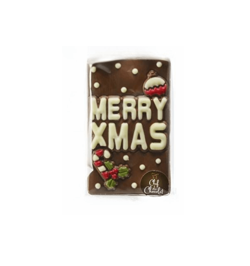 Handgemaakte Merry XMAS chocolade – Belgische melkchocolade met vrolijk kerstdesign (150 gram)