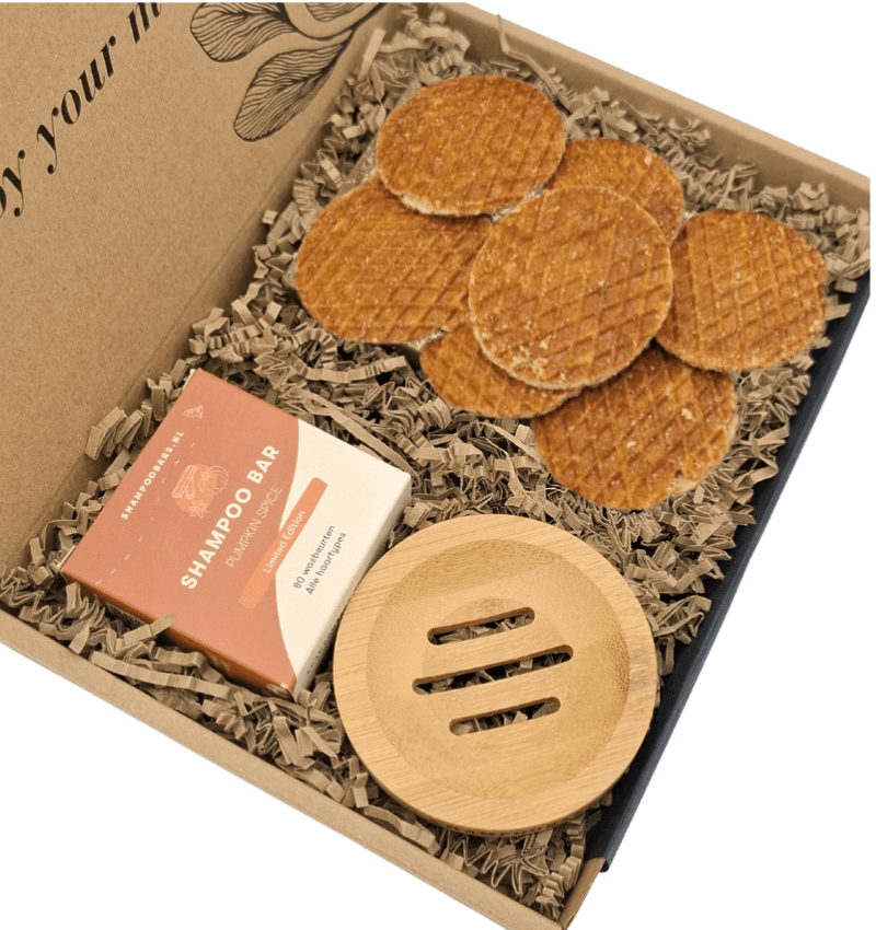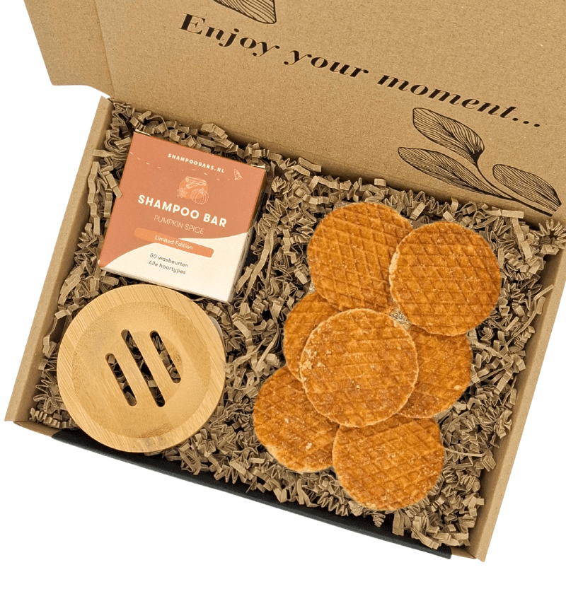 Een heerlijk verrassingspakket voor zowel de smaakpapillen als de zintuigen. Dit luxe brievenbuscadeau combineert een ambachtelijke stroopwafels met een geurige Pumpkin Spice shampoo bar en een duurzaam bamboe uitlekbakje. Perfect om iemand een warm en origineel cadeau te geven.