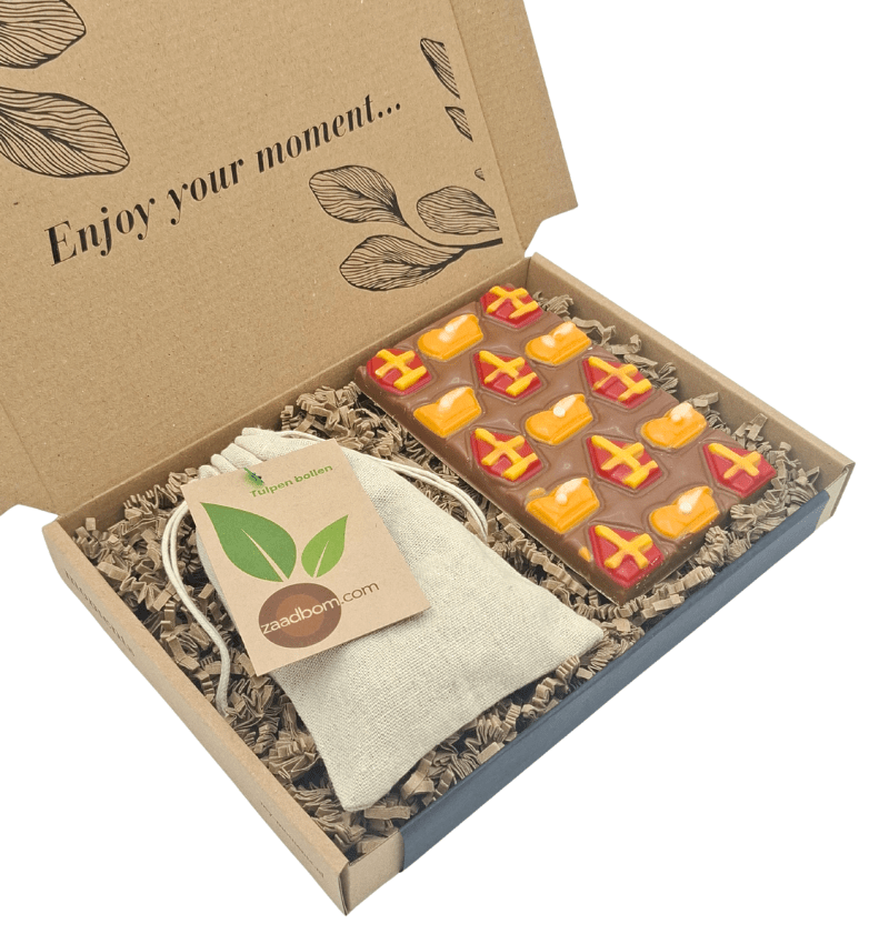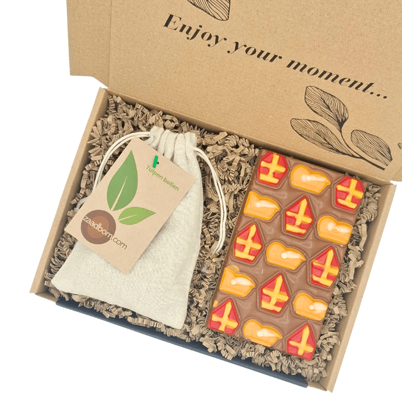 Verras iemand deze Sinterklaas met een origineel brievenbuspakket vol lekkers! Dit pakket combineert een heerlijke handgemaakte Sinterklaas-chocolade met een jute zakje gevuld met 7 prachtige tulpen. Perfect om direct als cadeau te versturen en iemands dag extra speciaal te maken. Voeg een leuke wenskaart toe en wij doen de rest