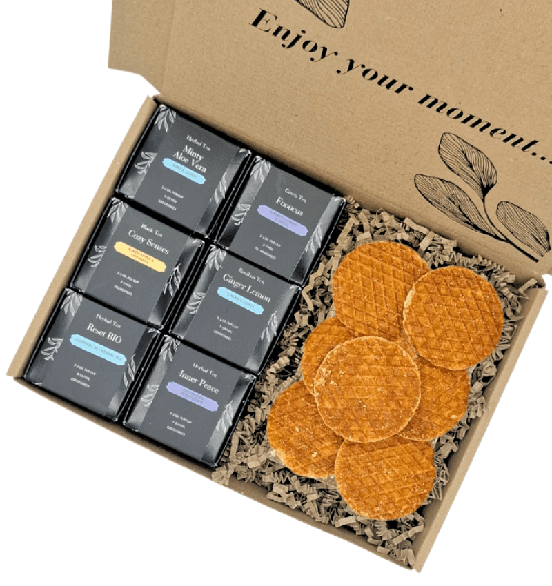 Een luxe brievenbus verpakking met 6 smaken losse thee en overheerlijke mini Stroopwafels. De thee is verpakt in elegante kleine doosjes. De inhoud varieert van ±11 tot ±14 gram per doosje, afhankelijk van de grofheid van de thee. Dat staat gelijk aan gemiddeld 6 kopjes thee per smaak.
