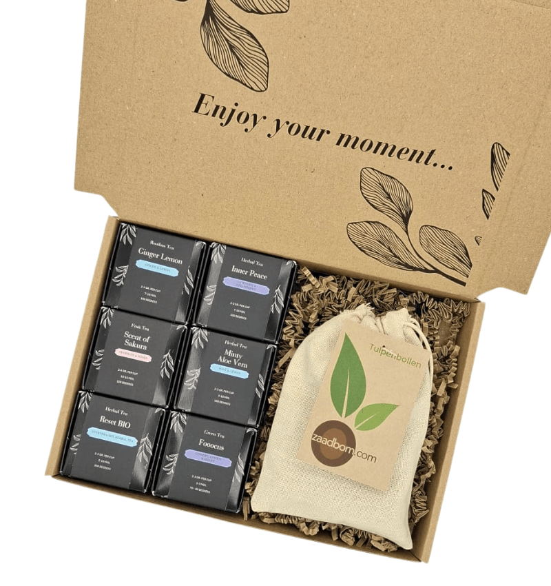 Een luxe brievenbus verpakking met 6 smaken losse thee en 7 tulpenbollen. De thee is verpakt in elegante kleine doosjes. De inhoud varieert van ±11 tot ±14 gram per doosje, afhankelijk van de grofheid van de thee. Dat staat gelijk aan gemiddeld 6 kopjes thee per smaak.